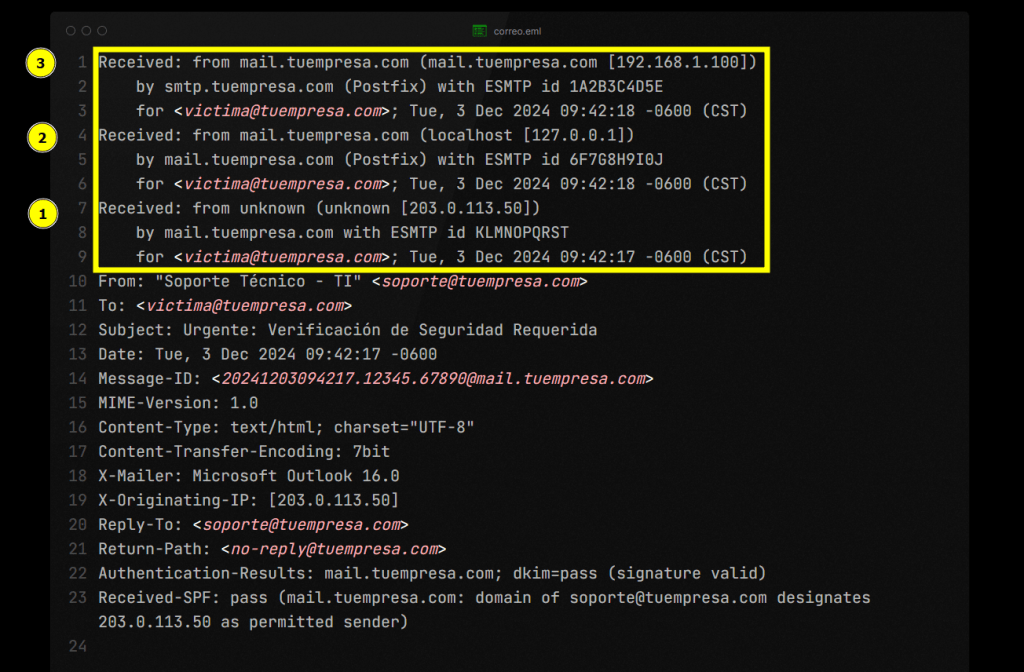 - mail.tuempresa.com este servidor recibió el correo desde la ip 203.0.113.50